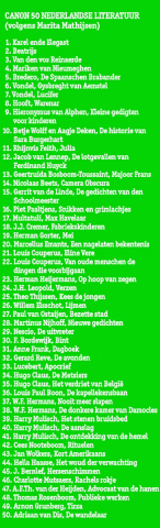 In zo’n land zou er een verplichte literatuurlijst zijn, met zo’n vijftig boeken die elke vwo’er gelezen zou moeten hebben. Inderdaad, vijftig verplichte werken, ongeveer tien uit de periode tot en met de 18e eeuw, ongeveer twintig voor de 19e en 20e eeuw tot de Tweede Wereldoorlog, twintig daarna. Daarop zouden de boeken staan waarnaar in gesprekken, kranten, opiniebladen en studies wel eens verwezen wordt, zoals Max Havelaar of De avonden. Verder werken waar wel eens citaten uit aangehaald worden, zoals Op hoop van zegen en Gysbreght van Aemstel, of werken waarin karakters voorkomen als Pieter Stastok en Kees de jongen. Kortom: werken die in het collectieve geheugen van de cultuur in Nederland (en Vlaanderen) een plaats hebben gekregen.